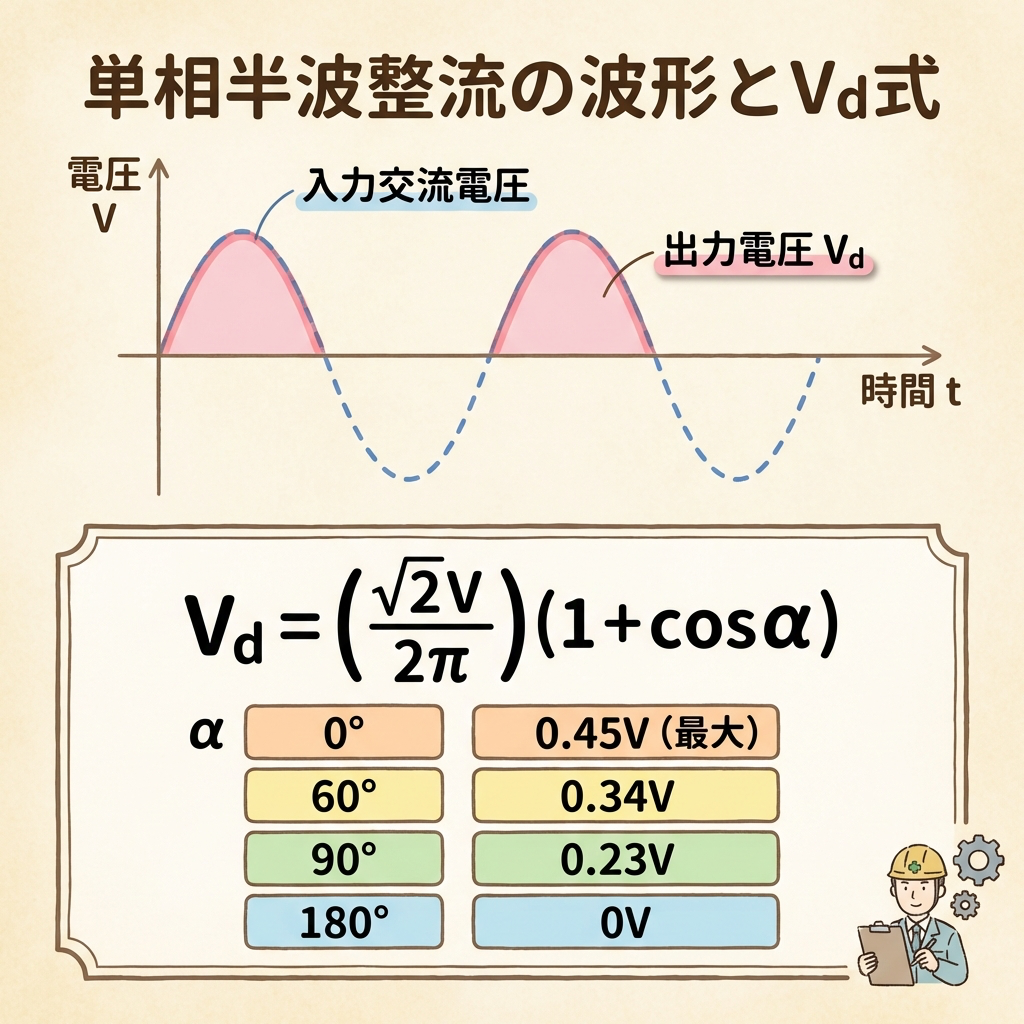 | 単相半波の式 | Vd = (√2V/2π)(1+cosα) |