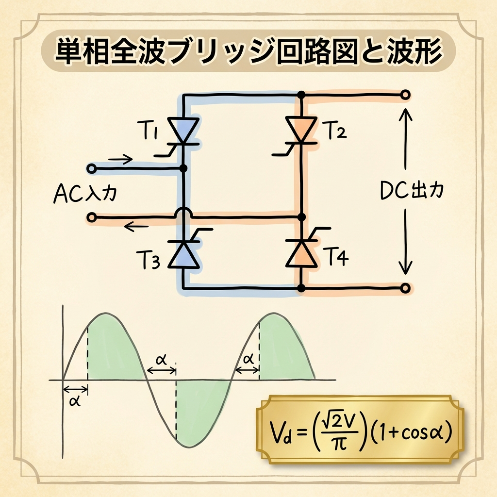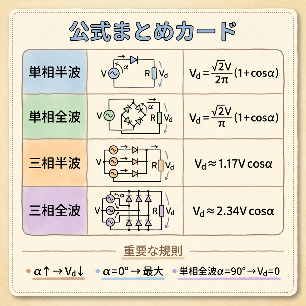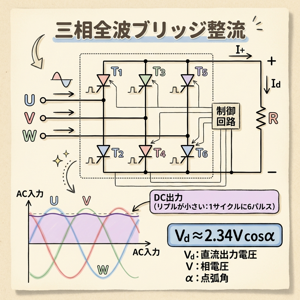 | 三相全波の式 | Vd ≈ 2.34V cosα(cos αの形。単相の(1+cosα)と異なる) |