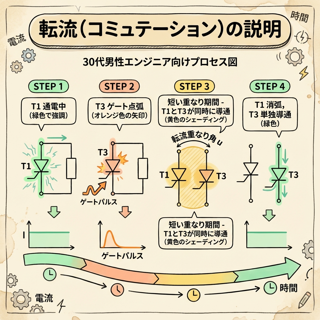 転流(commutation)とは、電流がある素子から別の素子へ移り変わる現象のことです。三相整流回路で次のサイリスタに点弧信号が送られると、電流が現在導通中のサイリスタから次のサイリスタへ「乗り換え」します。
