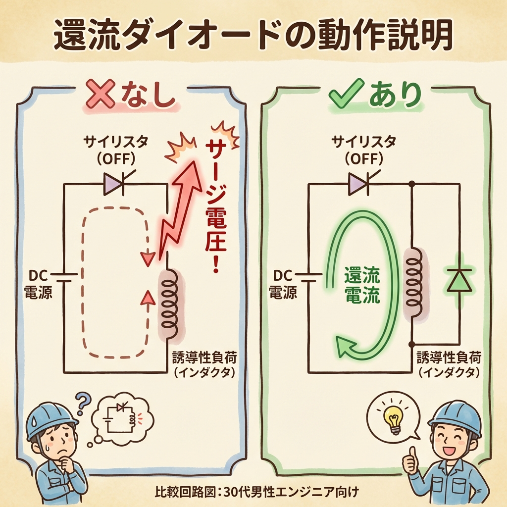 還流ダイオードは誘導負荷の保護に有効ですが、α>90°の逆変換動作(回生制動など)ができなくなります。回生が必要な用途では還流ダイオードなしの完全制御整流器を使い、別の方法でサージ対策をします。