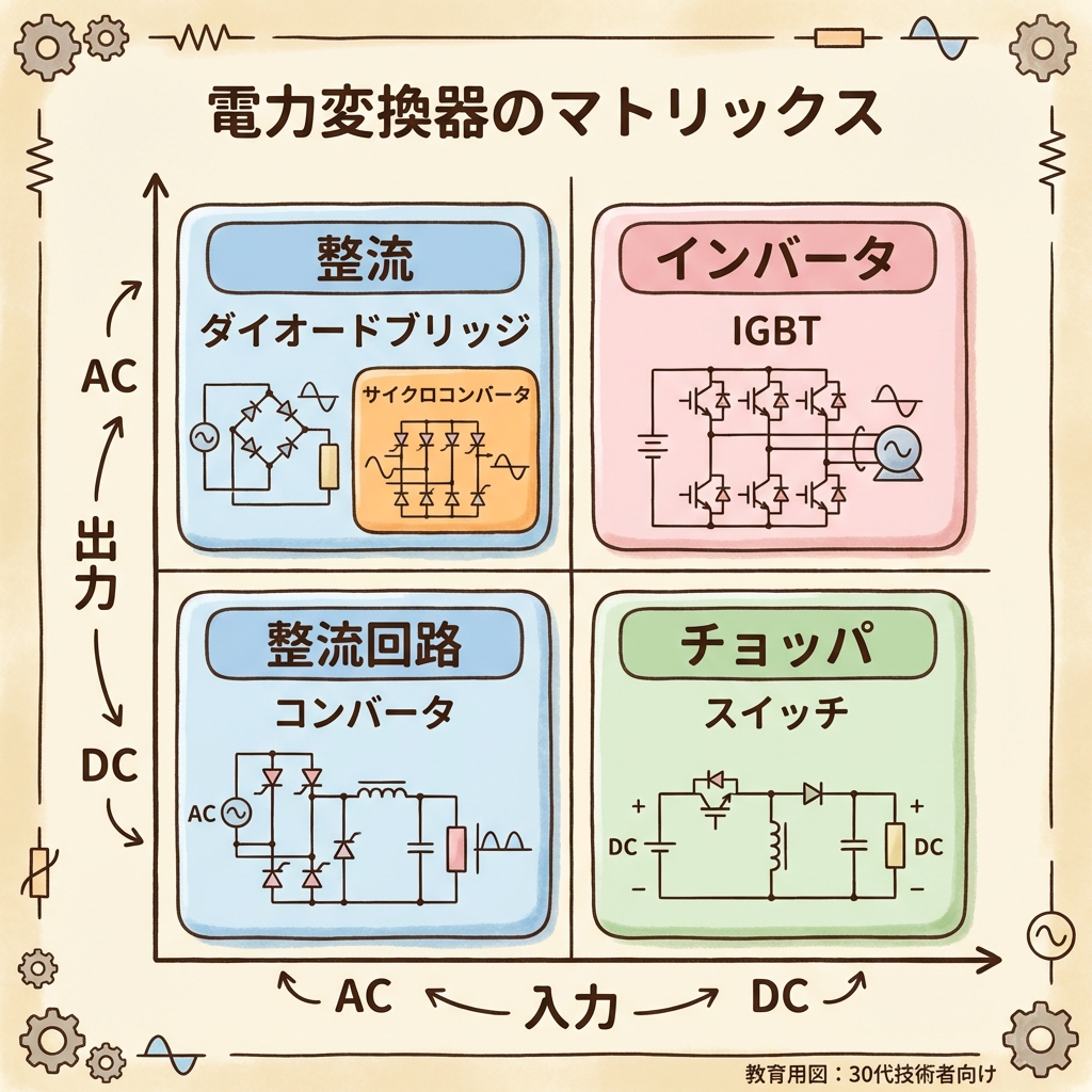 電力変換回路は入力(AC or DC)と出力(AC or DC)の組み合わせで4種類に分類されます。この分類を頭に入れるだけで、試験の選択肢を半分に絞れます。