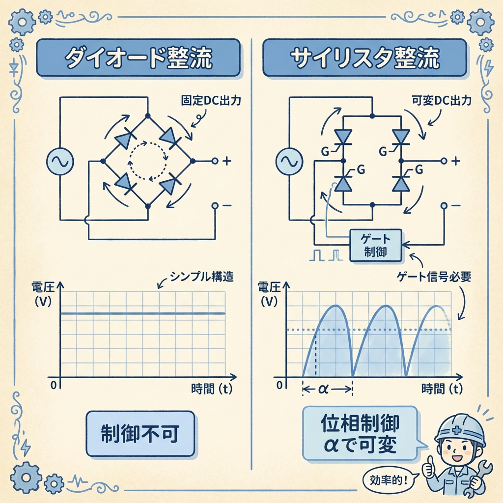 | AC→DC(整流) | ダイオード(制御不可)またはサイリスタ位相制御(制御角αで可変) |