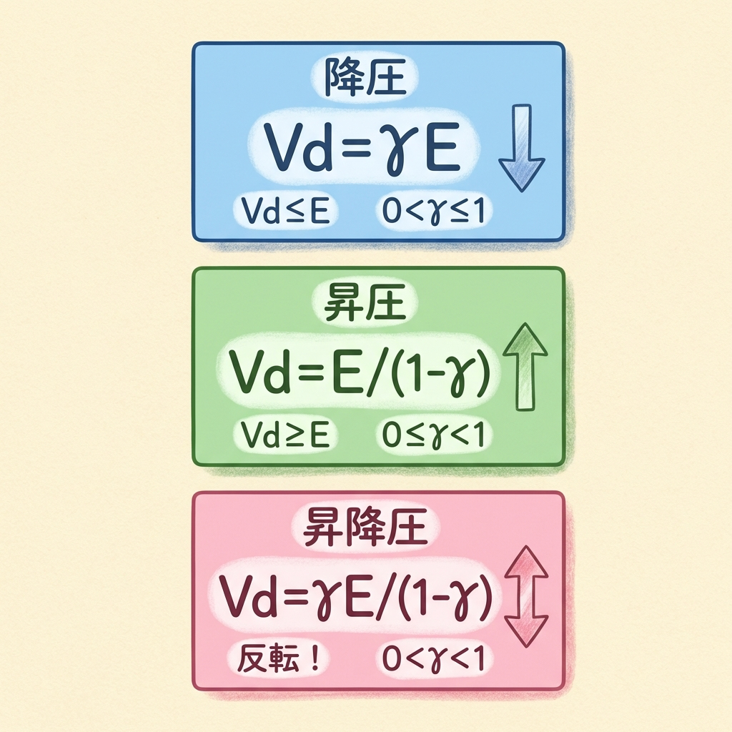 | 昇降圧 | ↑ 上がる | Vd = E(同じ) | 逆(反転) | フライバック電源 |