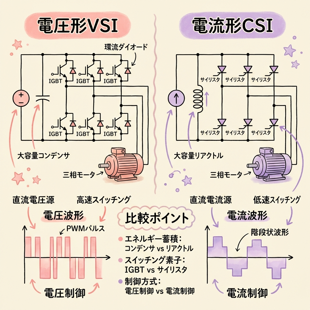 | 6 | 電圧形インバータの直流側にはリアクトルが接続される | ❌ 誤 | 電圧形→コンデンサ。リアクトル→電流形 |