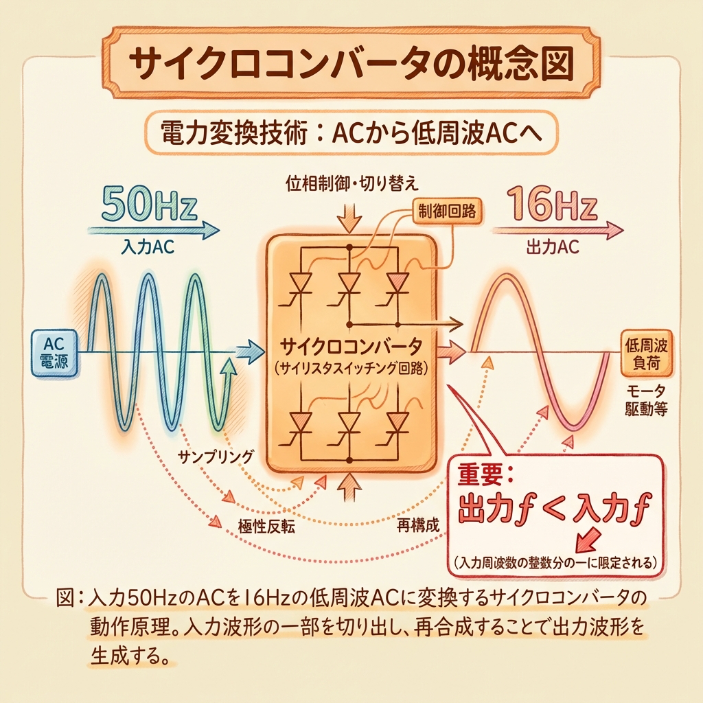 サイクロコンバータは直流段(整流→インバータ)を経由せずに、交流から直接異なる周波数の交流を作る回路です。多数のサイリスタを使って、入力交流の一部を切り出して合成します。