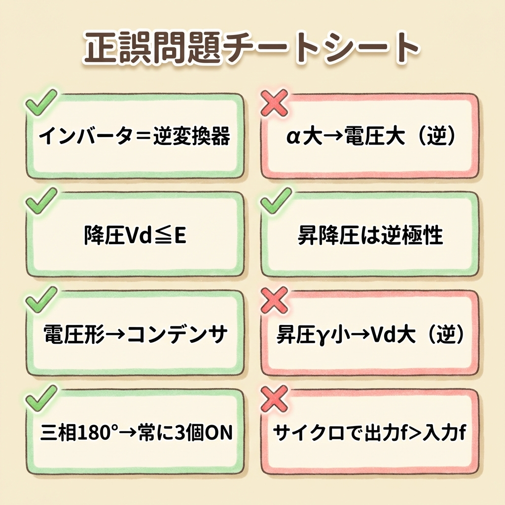 | 8 | サイクロコンバータは出力周波数を入力周波数より高くできる | ❌ 誤 | 出力f < 入力f が原理上の制限 |