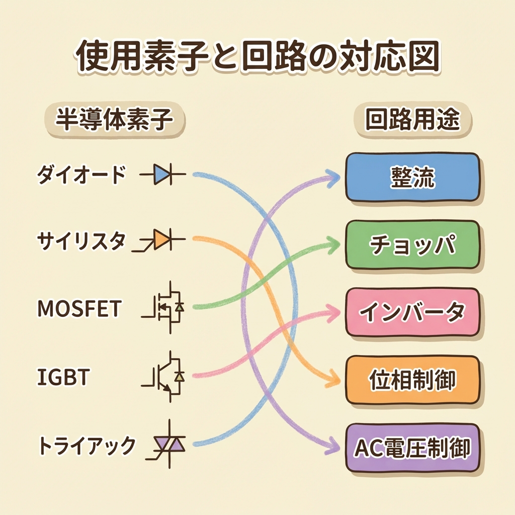- 各回路の「使用素子・制御方式・用途」の対応関係