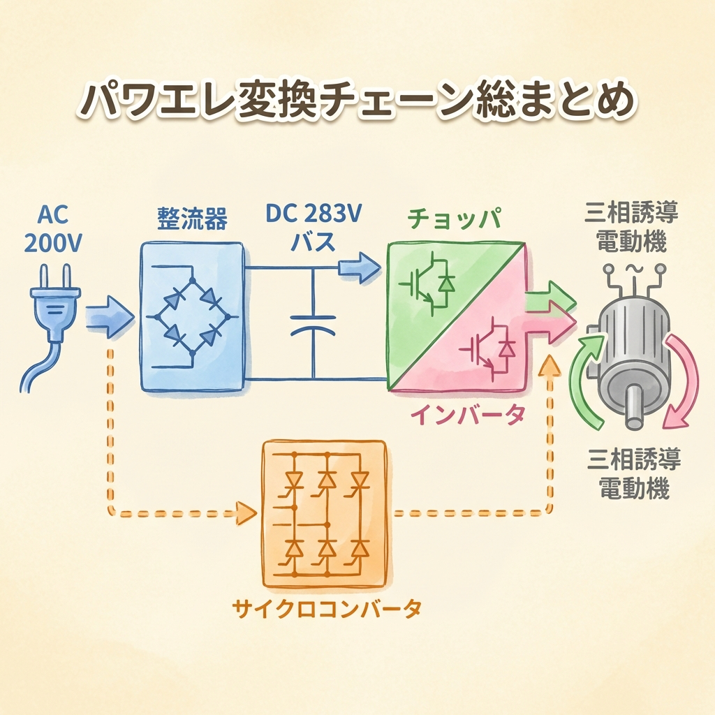 電験三種のパワエレ分野は整流・チョッパ・インバータ・サイクロコンバータと複数の回路が登場します。個別に覚えるより、「何を何に変換するか」という1軸で全部整理すると記憶が定着します。この記事はパワエレシリーズの総まとめとして、試験直前に見返す「チートシート」として使ってください。