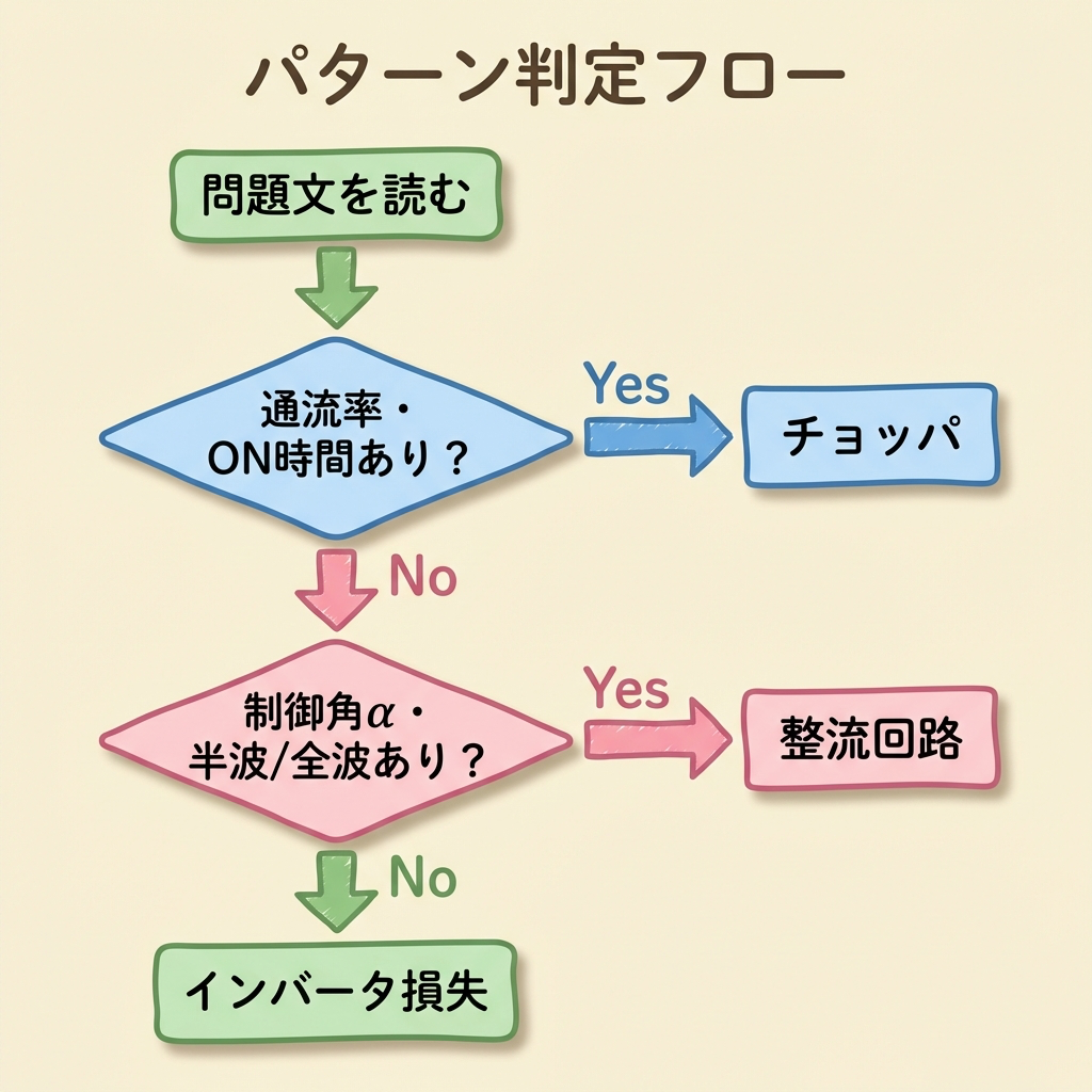 | パターンB 整流回路 | 回路種類確認 → 公式選択 → α代入(cos値を先に計算)→ P = Vd²/R |