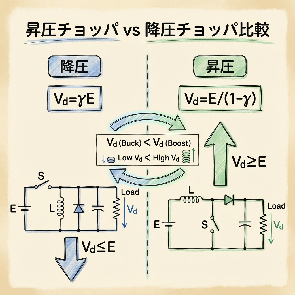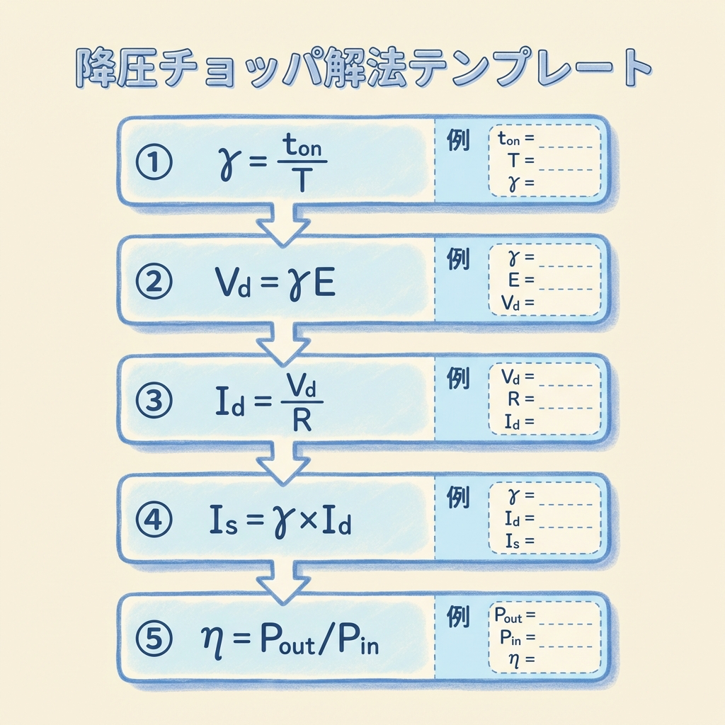 | 1 | 昇圧で Vd = γE を使う | 昇圧は Vd = E/(1−γ) | 「昇圧は分母に(1-γ)」と唱えてから代入 |