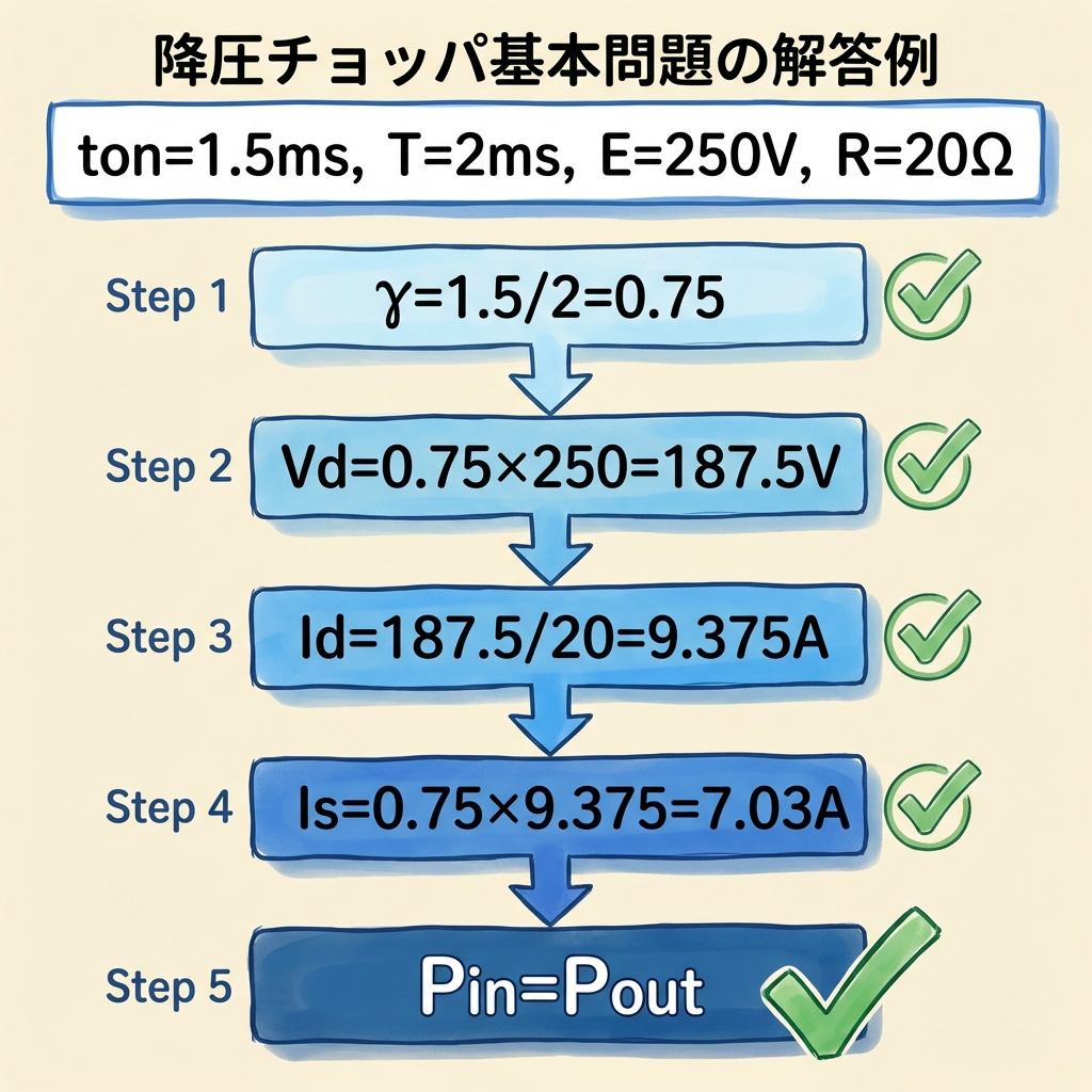 | パターンA 降圧チョッパ | γ = ton/T → Vd = γE → Id = Vd/R → Is = γ×Id(電力保存で検算) |