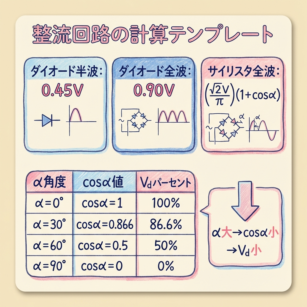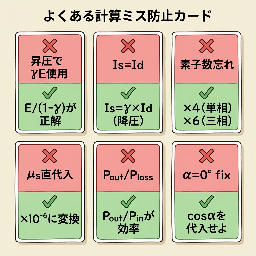 | 3 | 整流で α = 0° の最大値式にαを代入しない(α=0のまま) | Vd = (√2V/π)(1+cosα)に α を正しく代入 | cos値を先に計算してメモする(cos60°=0.5等) |