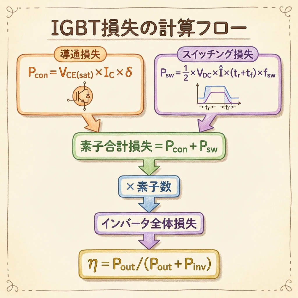 | 4 | IGBT損失で素子数を掛け忘れる | 単相×4、三相×6(FWD含む場合は×8 or ×12) | 問題文の回路図で素子数を数えてから計算開始 |