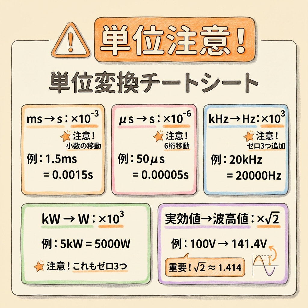 | 5 | μs や kHz をそのまま代入する | 必ず SI 単位(s、Hz、W)に統一してから代入 | 計算欄の最初に「1 μs = 10⁻⁶ s」とメモ |