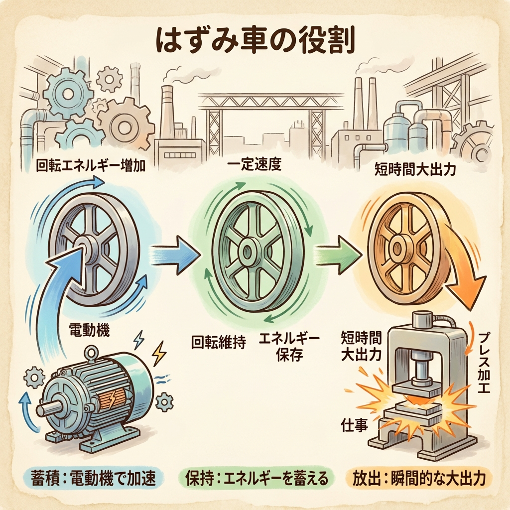 たとえるなら「回転するバッテリー」です。電気のバッテリーが電気エネルギーを蓄えるように、はずみ車は回転の運動エネルギーを蓄えます。