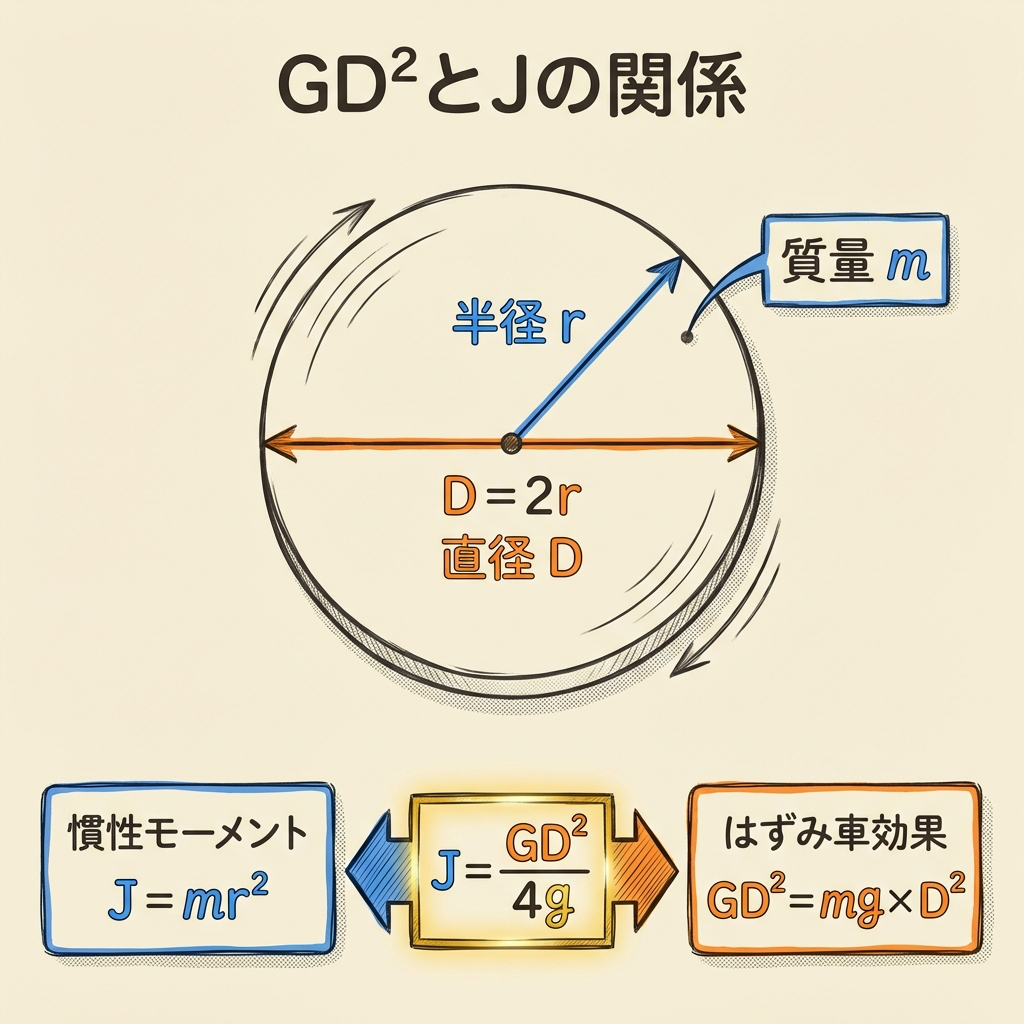 - GD²(はずみ車効果)は「回転体の回しにくさ」を表す。J = GD²/(4g) で慣性モーメントに換算
