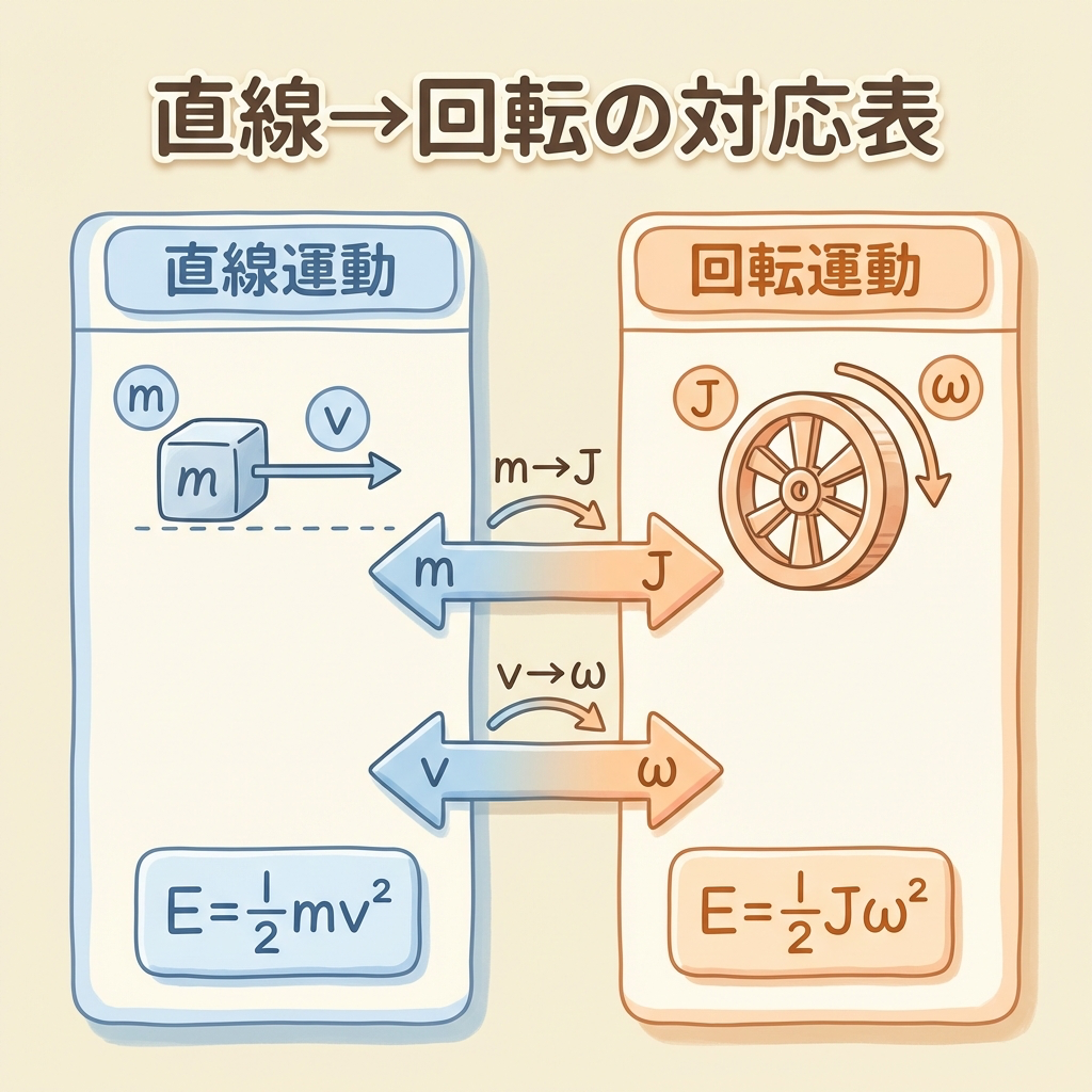 - 回転エネルギー:E = ½Jω²(直線運動の E=½mv² の回転版)