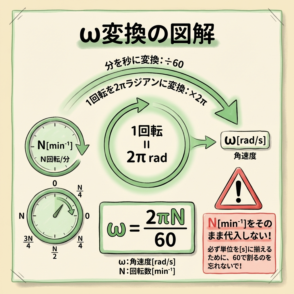 試験では回転数が N [min⁻¹](= rpm)で与えられますが、公式は ω [rad/s] を使います。変換式は以下の通りです。