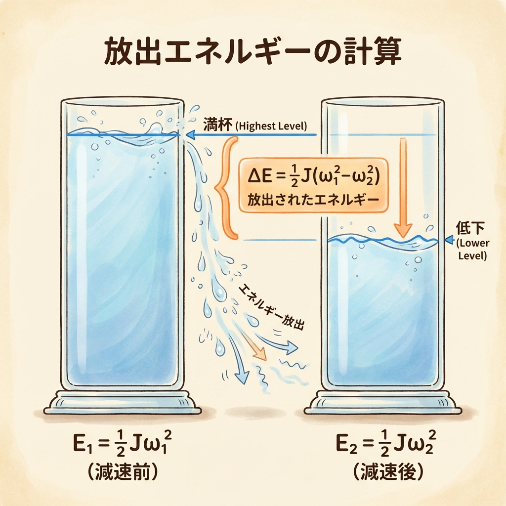 - 放出エネルギー:ΔE = ½J(ω₁² − ω₂²)(減速前後の差)