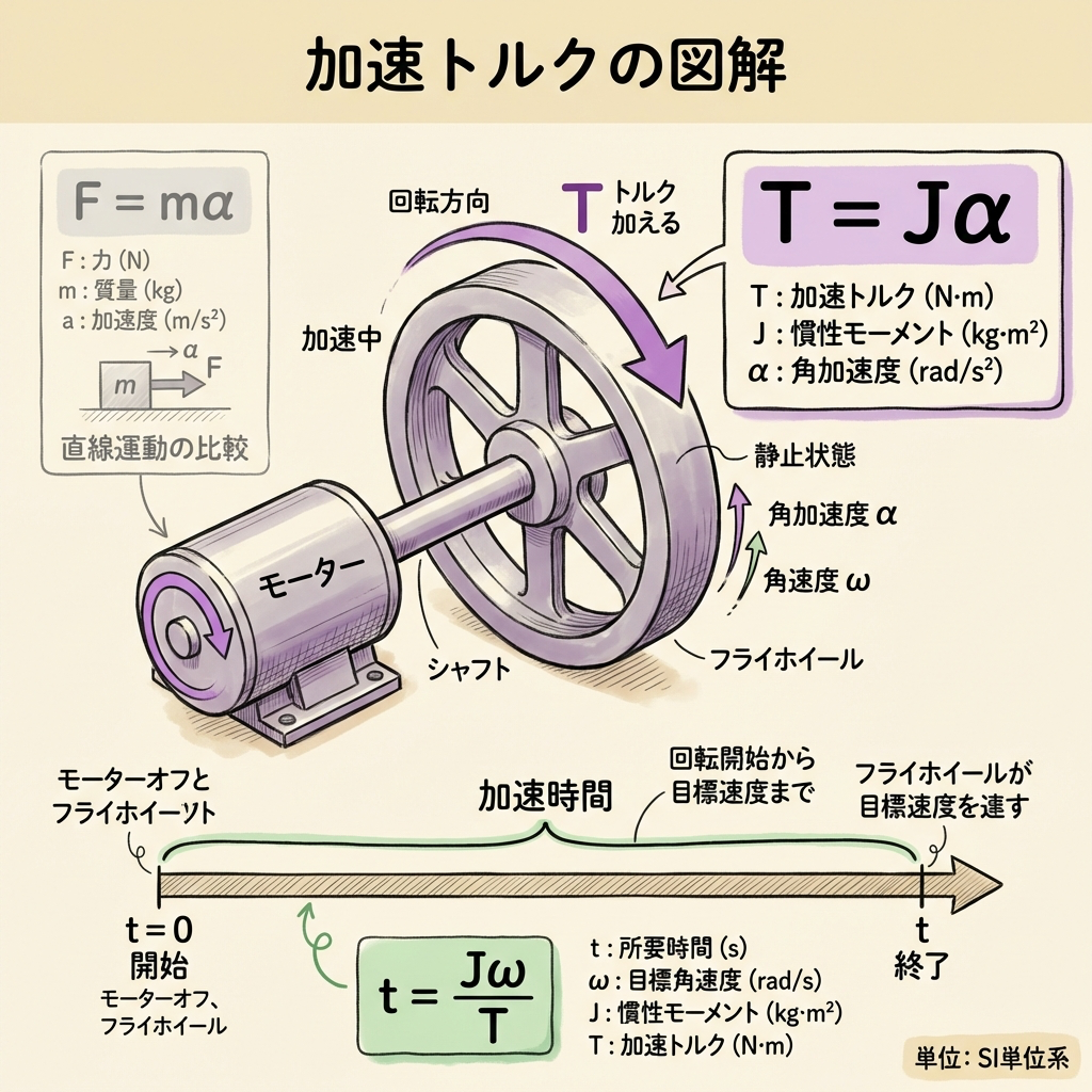 | ③ 加速時間 | 「一定トルクで○rpmまで加速する時間を求めよ」 | t = Jω/T |
