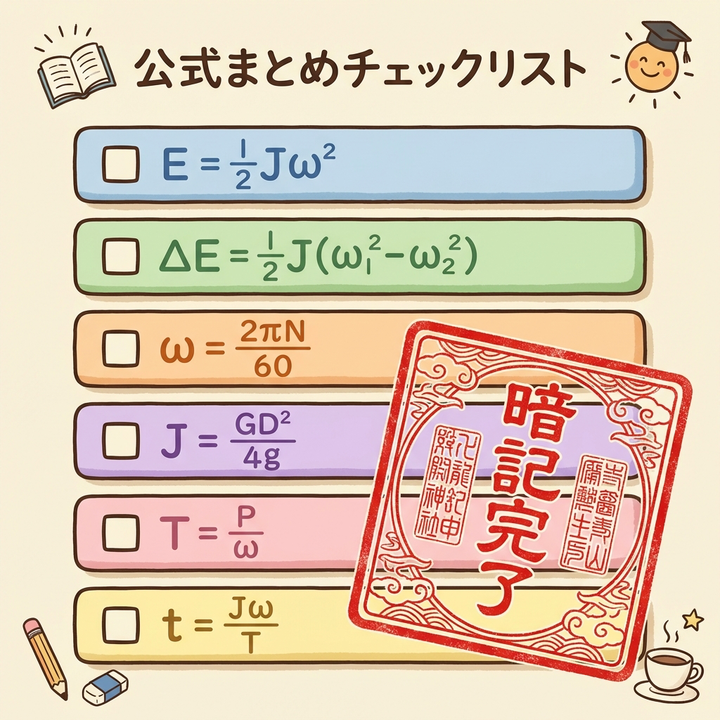 はずみ車の問題は、結局のところ「½Jω² に正しい値を代入するだけ」です。ω = 2πN/60 の変換さえ忘れなければ、計算自体はシンプル。この記事の計算例を2〜3回手で解いて、変換→代入の流れを体に染み込ませてください。