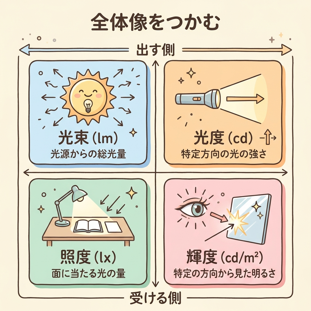 ・出す側の量 → 光束(総量)、光度(方向別の強さ)、輝度(まぶしさ)