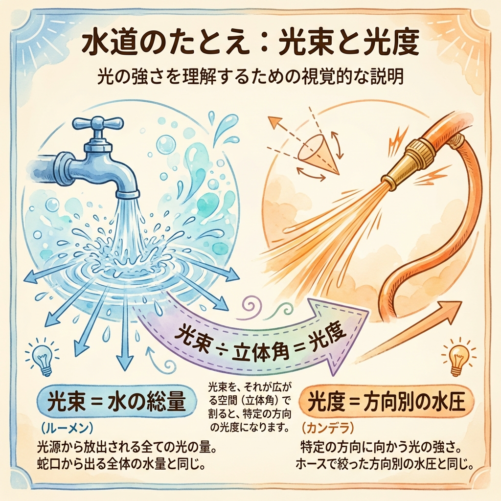 - 光束・光度・照度・輝度の意味の違いが「水道のたとえ」で直感的にわかる