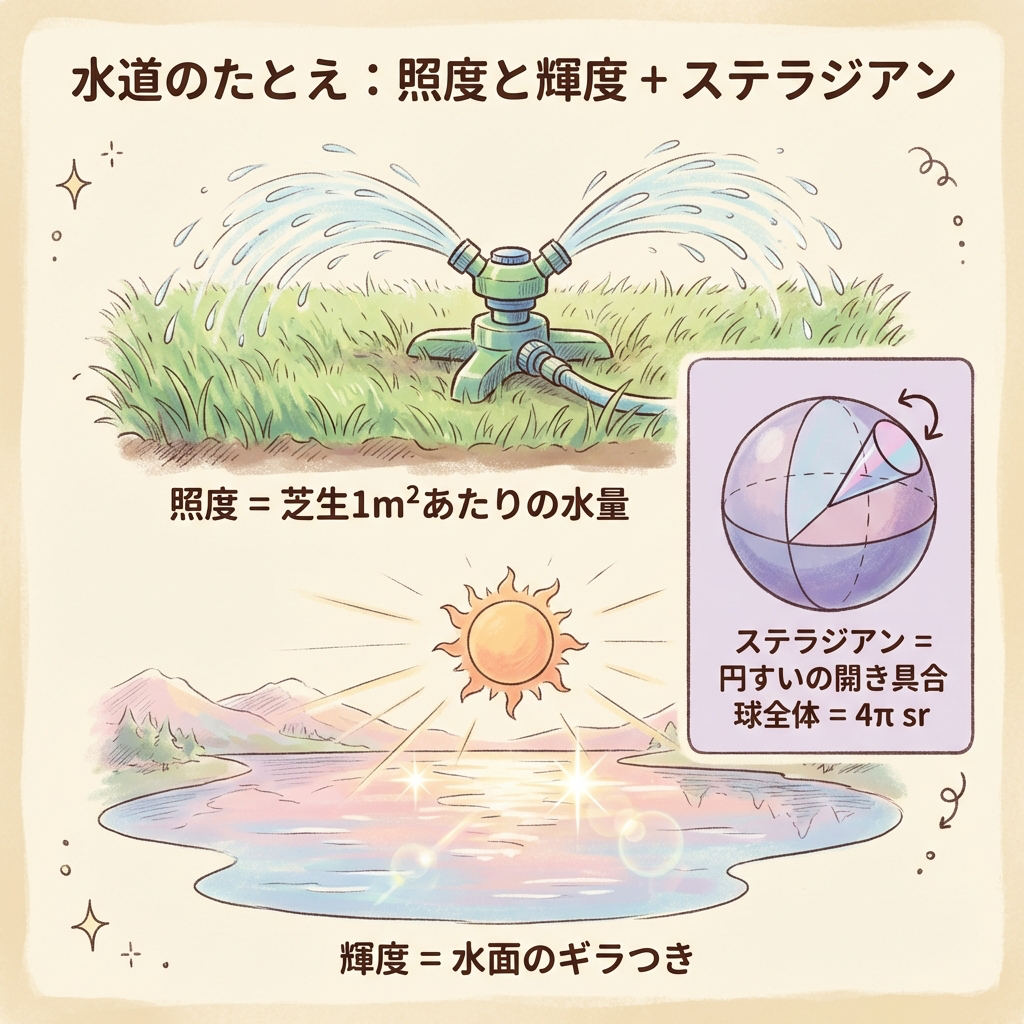 - 照度(lx)= 光束 ÷ 面積 → 受ける側の明るさ(芝生への散水量/m²)