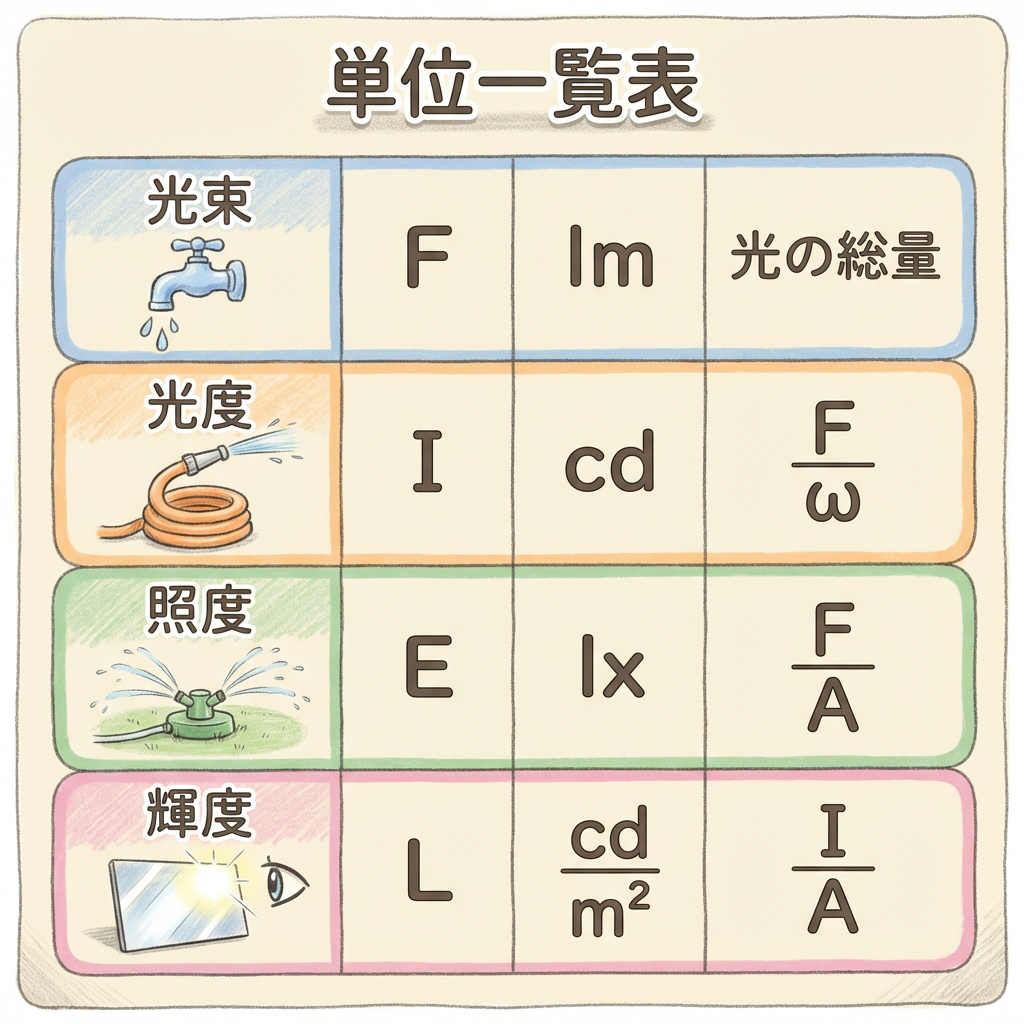- 照度だけが「受ける側」の量。残り3つは「出す側」