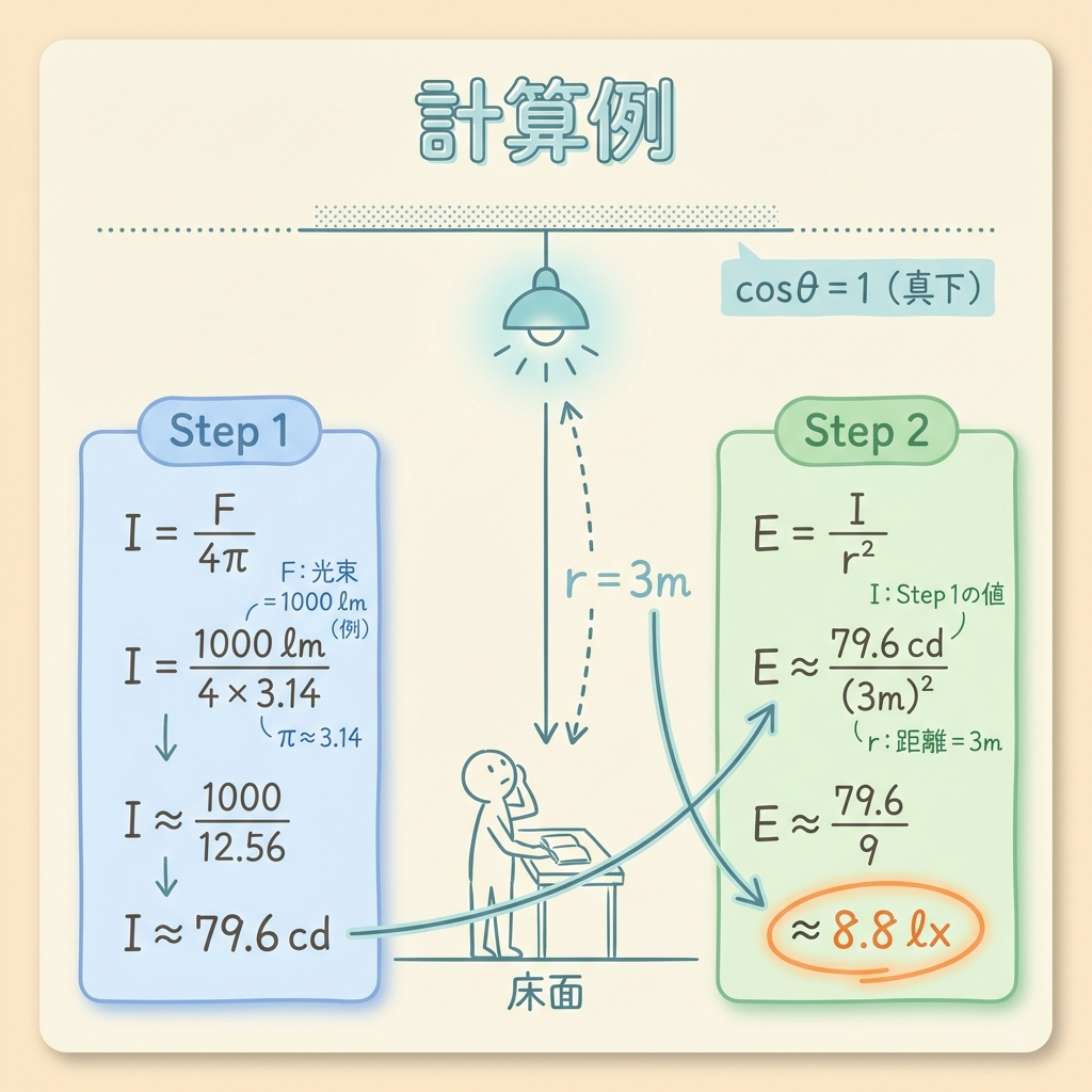 「点光源から r [m] 離れた面の照度を求めよ」というパターン。先ほどの計算例がそのまま使えます。