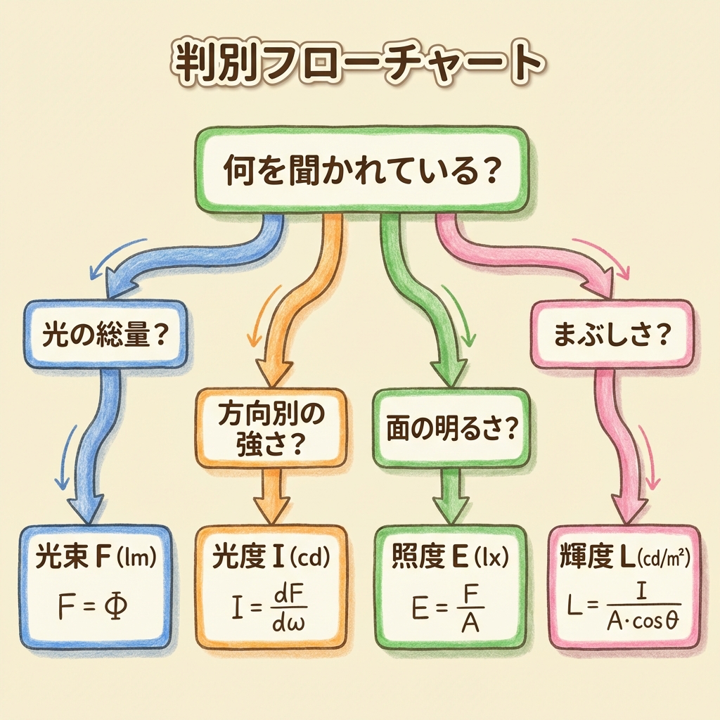 問題文に「机上面の照度」と書いてあれば照度(受ける側)。「蛍光灯の輝度」と書いてあれば輝度(出す側)。主語が「面」なら照度、「光源・反射面」なら輝度と覚えましょう。