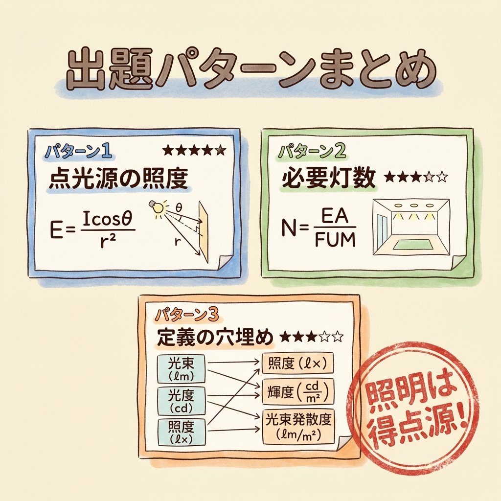 機械科目の照明分野は、出題パターンがほぼ決まっています。以下の3パターンをマスターすれば、本番で確実に得点できます。