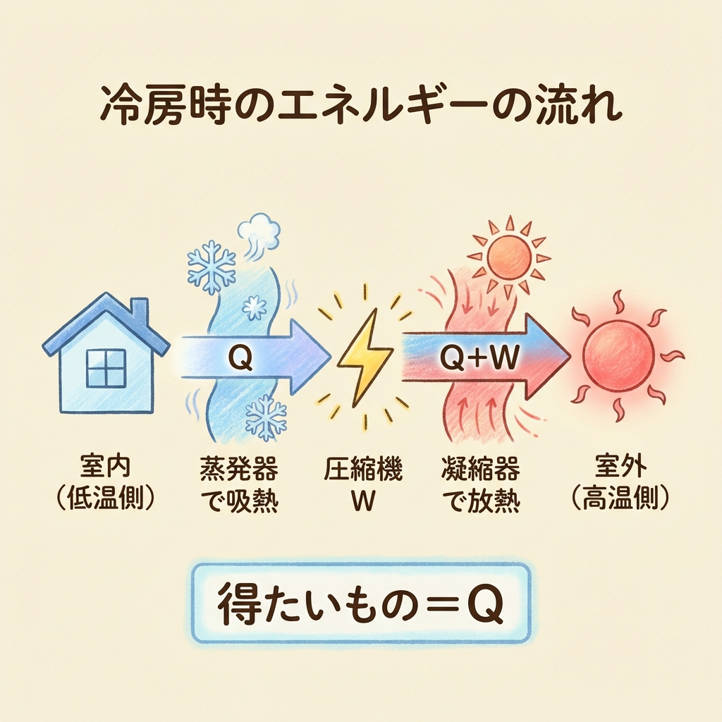 暖房のときは、室外から運んできた熱Qに加えて、圧縮機を動かすために使った電力Wも最終的に熱に変わって室内を温めます。つまり「電力Wが丸ごと暖房のボーナスになる」のです。冷房時はこのWが室外に捨てられるだけなので、ボーナスはゼロ。だから暖房COPのほうが「+1」だけ大きいのです。