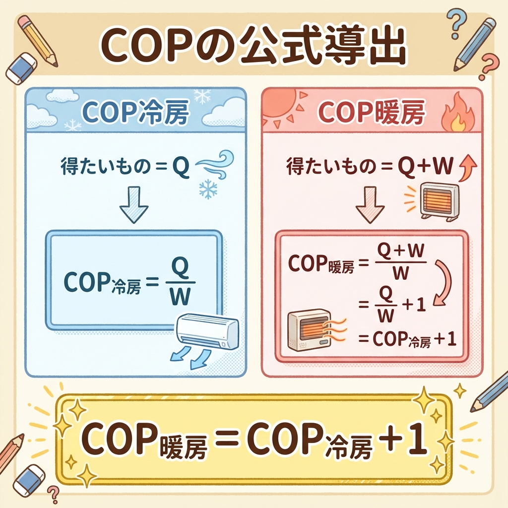 これで「暖房COP = 冷房COP + 1」が証明されました。丸暗記ではなく、エネルギー保存則から2行で導出できるのです。