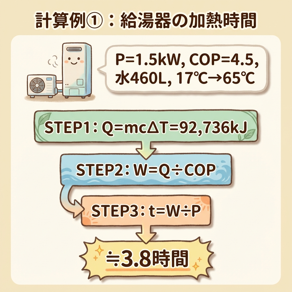 エコキュート(ヒートポンプ式給湯器)が「深夜電力で約4時間かけてお湯を沸かす」のは、まさにこの計算の通りです。460LはJIS規格の大型タンクの標準容量。電験三種の問題は、実在の製品仕様をそのまま出題することが多いです。