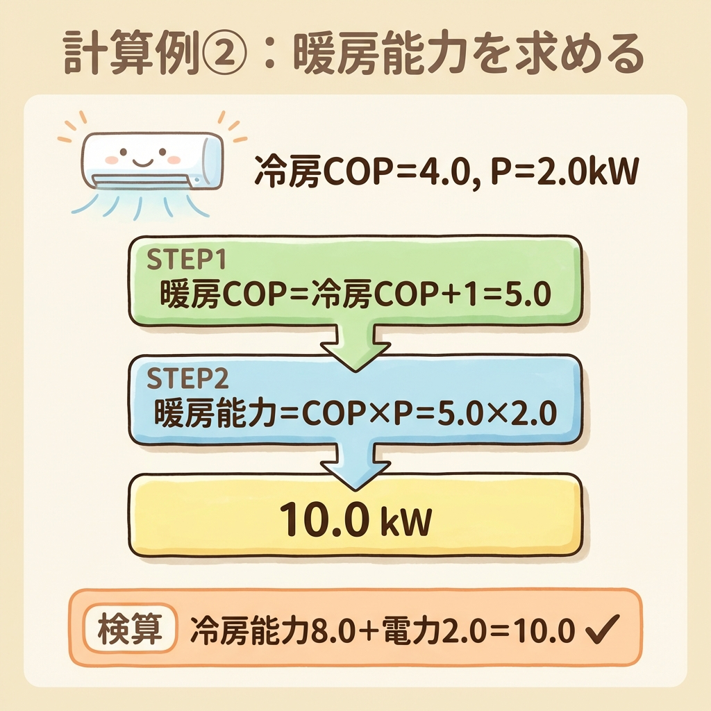 別ルートでも同じ答えになります。「暖房能力 = 冷房能力 + 消費電力」という関係はエネルギー保存則そのもの。検算に使えるので覚えておきましょう。