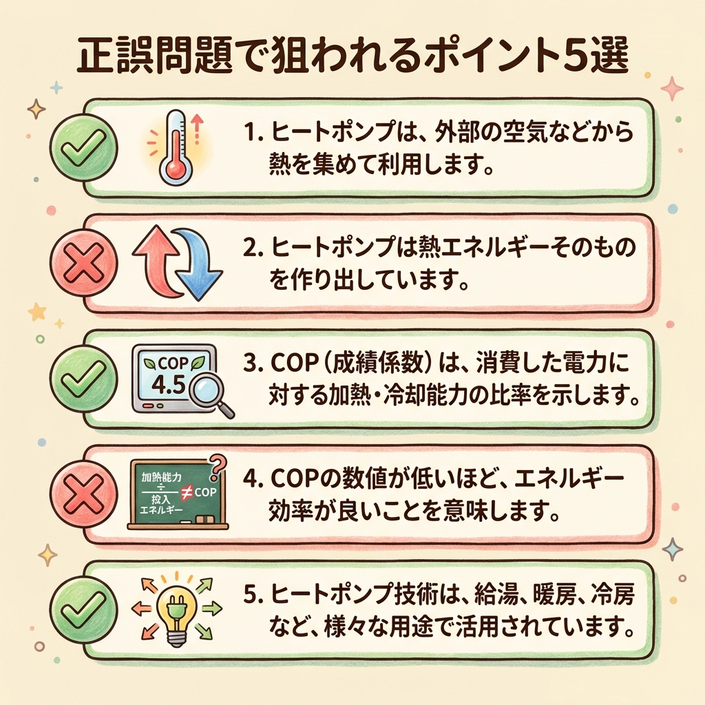 COP計算だけでなく、ヒートポンプの原理に関する正誤問題も出題されます。引っかけやすいポイントを整理しておきましょう。