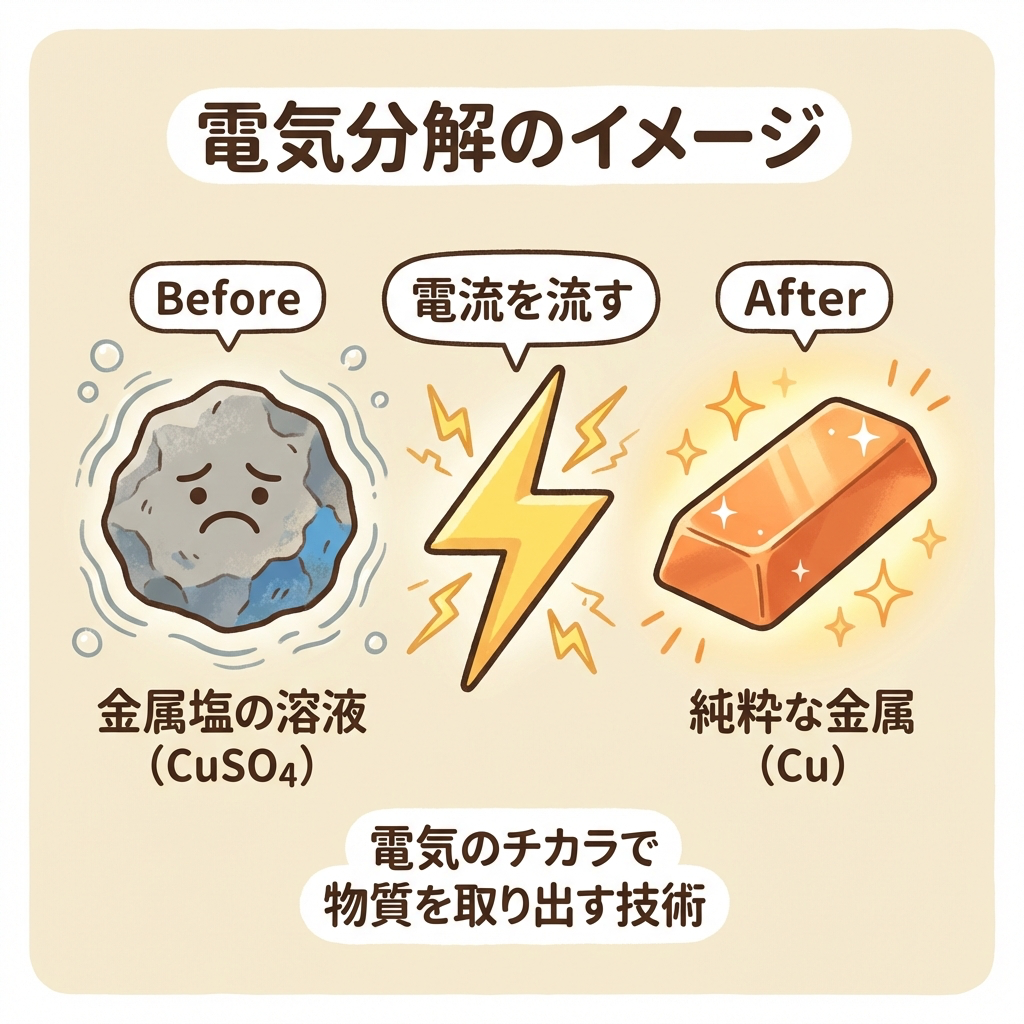 電気分解のイメージ|電気で「鉱石から金属を引っこ抜く」