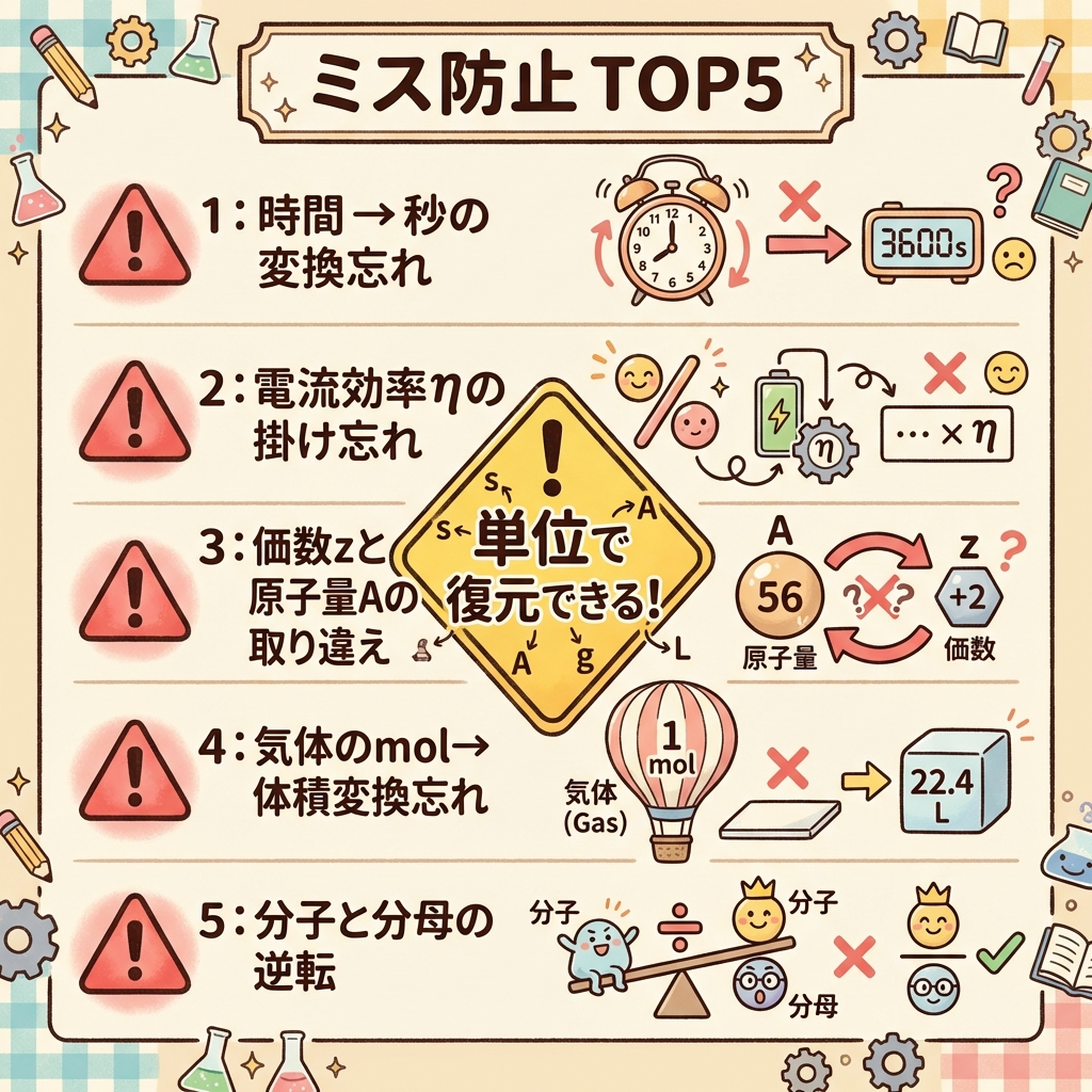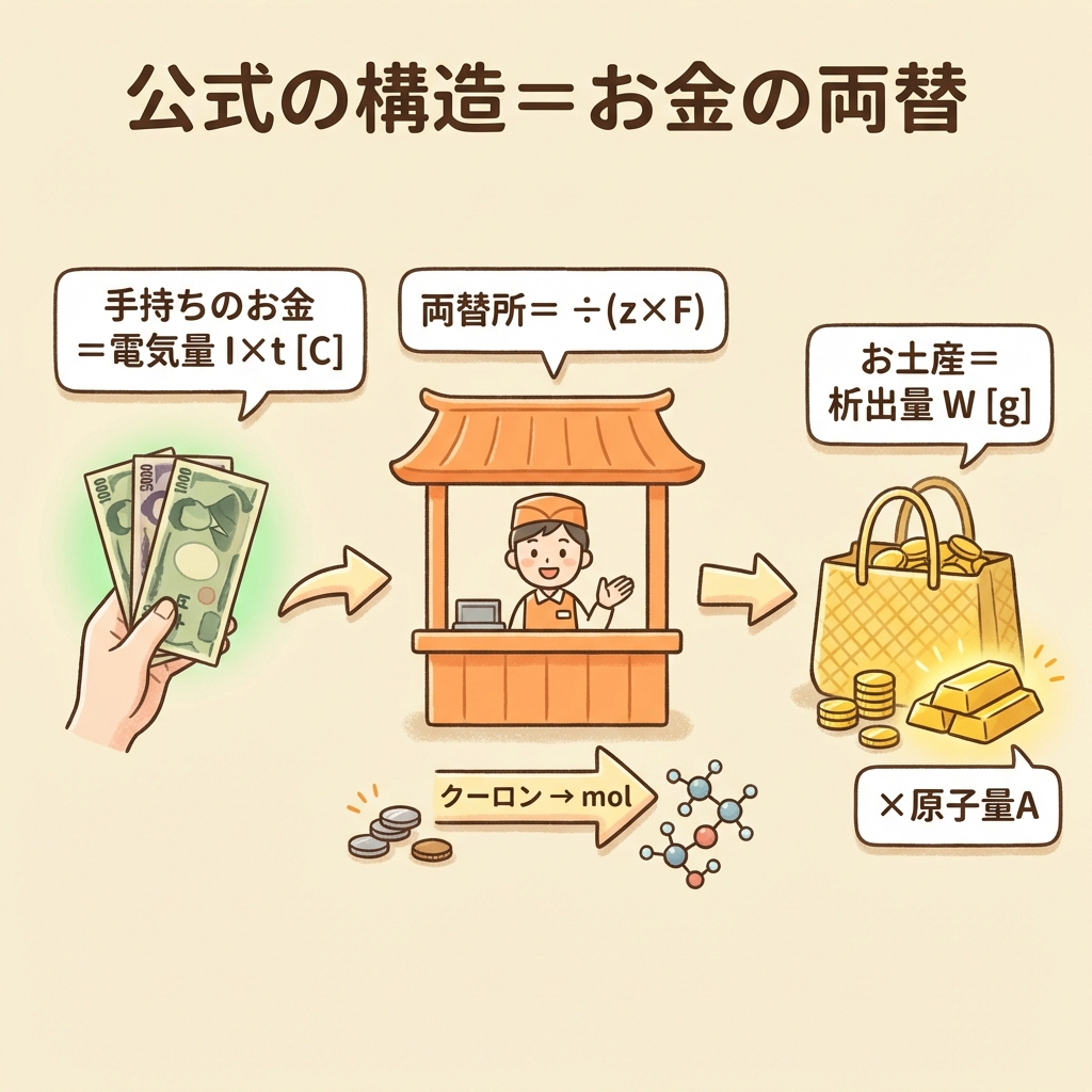 W = AIt / zF → 分子にA, I, t、分母にz, F。迷ったら「両替」のステップを思い出す。