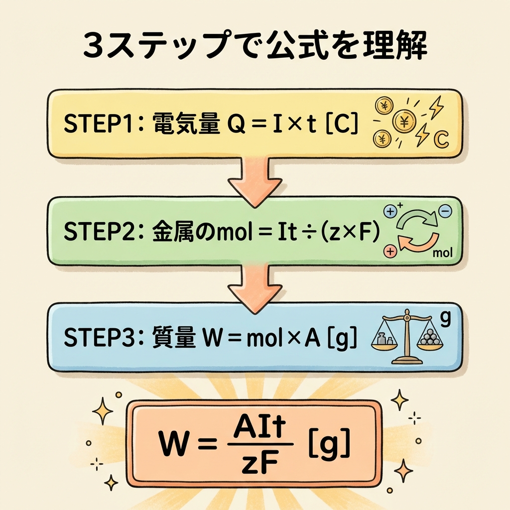 公式 W = AIt / zF の成り立ちを3ステップで追う
