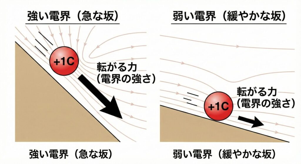 電界とは、そこに+1C(クーロン)の電気を置いたとき、「どれくらい強く転がり落ちるか(押されるか)」を表す数値です。