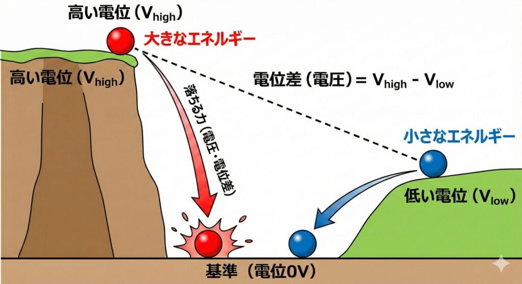 高いところにあるボールほど、落ちたときに大きなエネルギーを持ちます。これが電圧(電位差)の正体です。