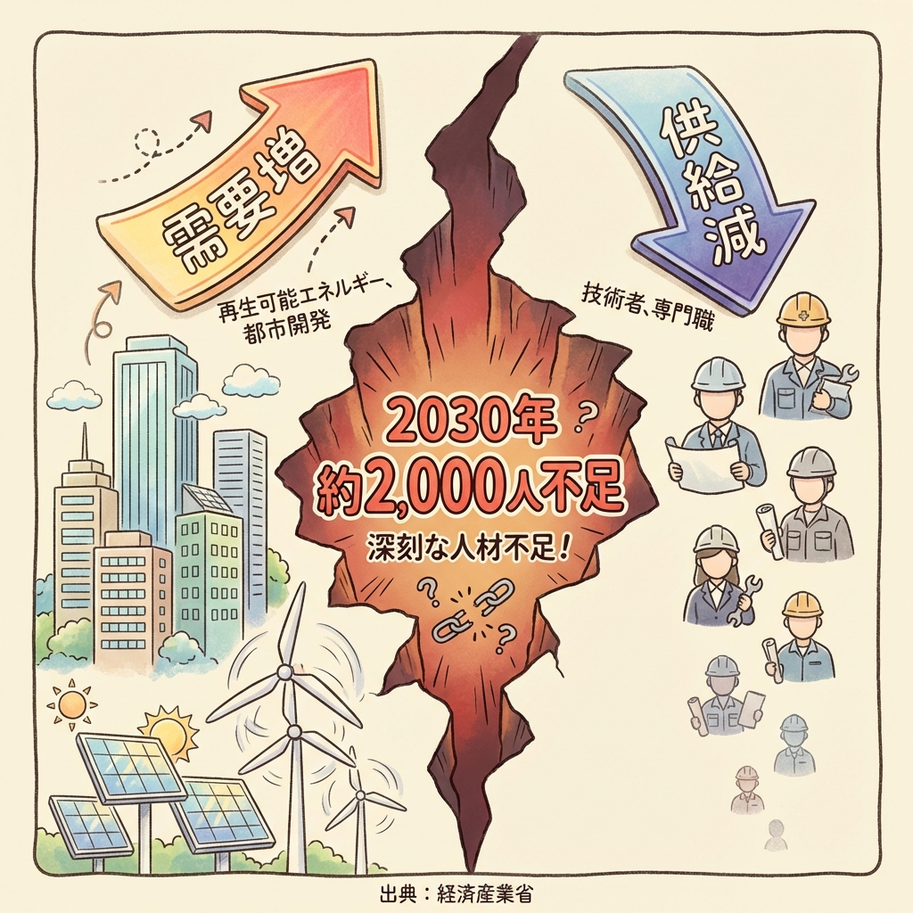 📉 供給の減少 現役技術者の高齢化(外部委託従事者の約半数が60代以上)。免状取得者数が10年で約1割減少