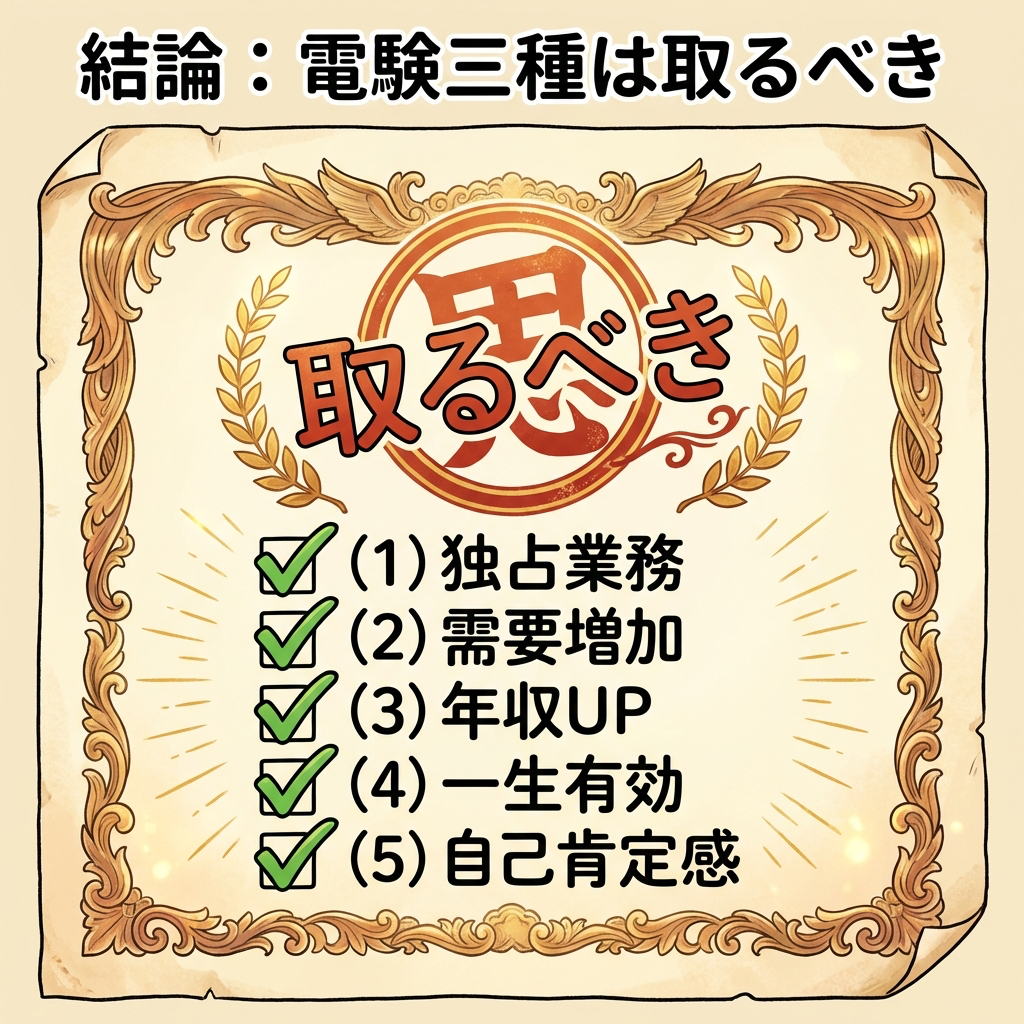 電験三種は一生有効、更新不要。定年後も働ける選択肢がある。副業(外部選任)で月10万円以上も現実的。「食いっぱぐれない」という安心感は、何物にも代えがたいものです。