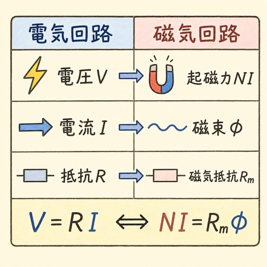 ここがこの記事のクライマックス、というより「ここさえ覚えれば終わり」の最重要ポイントです。電気回路と磁気回路は、文字が違うだけで構造が完全に同じです。
