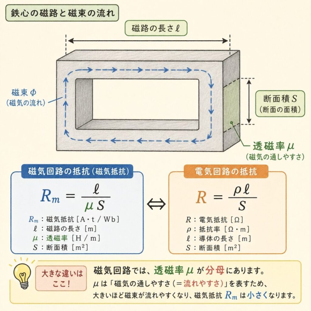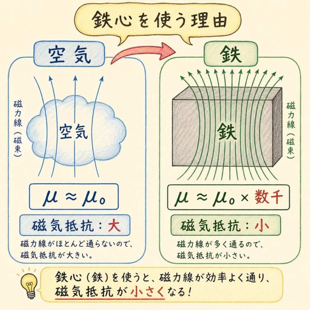 変圧器やモータの鉄心が「鉄」でできている理由は、ここにあります。鉄は空気よりも透磁率μが数千倍大きいため、磁気抵抗が圧倒的に小さくなる。つまり「磁束を流しやすい道」として機能します。