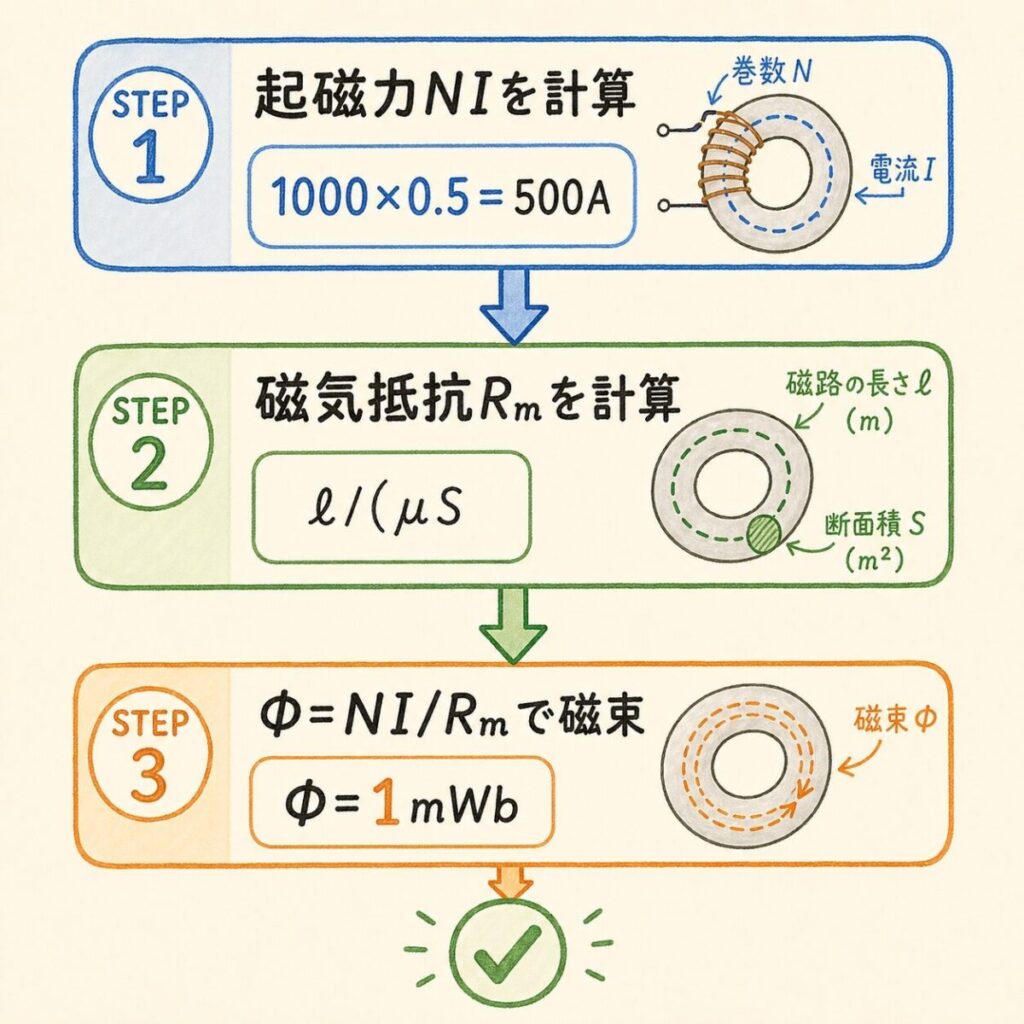 たったこれだけです。NI を計算 → Rm を計算 → 割り算。電気回路でV÷Rで電流を求めるのと、まったく同じ手順です。
