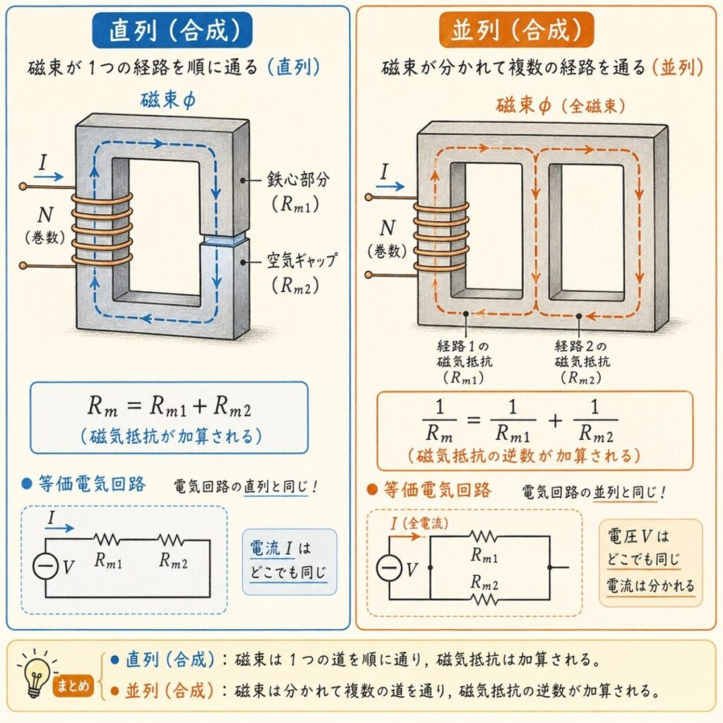 ここまで来たら、残りも電気回路の知識がそのまま使えます。磁気回路に「途中で材料が変わる部分」(鉄心の途中に空気のすきまなど)があったとき、磁気抵抗の合成計算が必要になります。