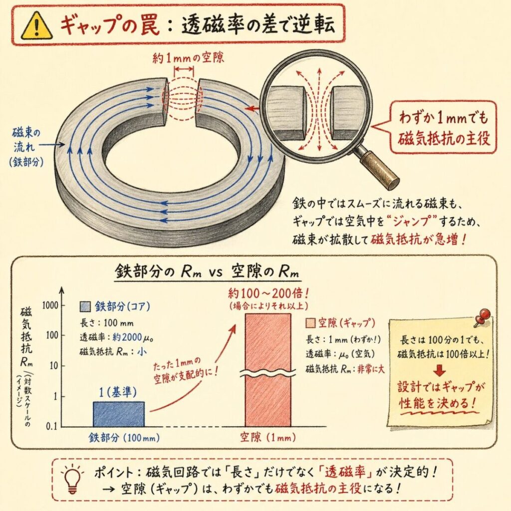 鉄の透磁率は空気の数千倍。だからたった1mmの空隙でも、磁気抵抗の主要部分は空気側になります。