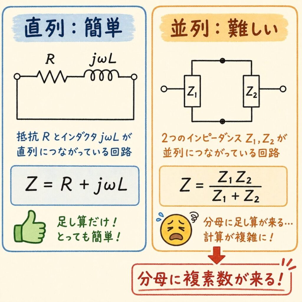 直列回路なら、複素インピーダンスは足し算するだけです。Z = R + jωL のようにシンプル。でも並列になった瞬間、計算難易度が一気に跳ね上がります。